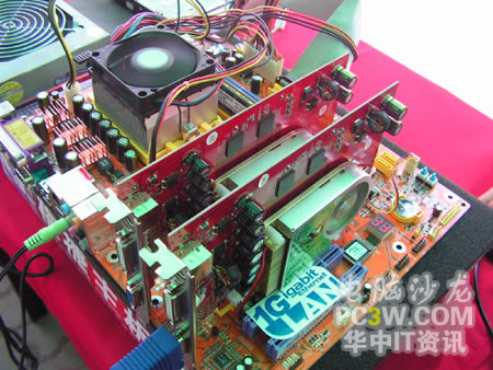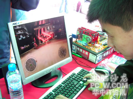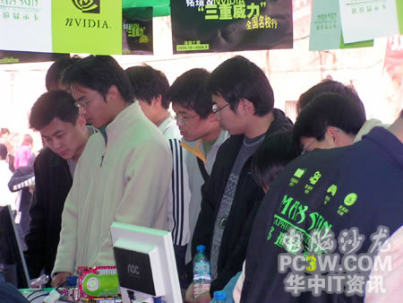 作為NVIDIA從去年來就大力推廣的SLI技術自然是最能吸引大家注意的,不少同學都對這種雙卡并聯技術產生了濃厚的興趣。工作人員也對SLI的一些具體細節進行了詳實而周到的解釋。