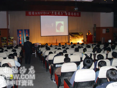 校園行也力圖讓廣大學生真實的體驗來自NVIDIA的強大新技術所帶來的震撼效果,特別是SM3.0、HDR以及SLI這三大顯示技術。產品展臺上擺滿了各款銘瑄支持這“三重威力”的顯卡產品。從入門級的6200TC直到最近被各大IT媒體所熱炒的6800GS,展示產品可以說是琳瑯滿目。