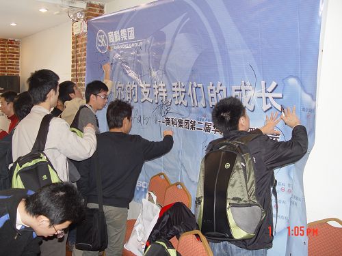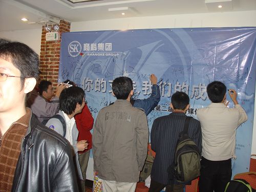 在會議結(jié)束的最后,我們請上了所有的媒體精英們在我們準備的背景板上寫下了對商科的祝福,明天會更好!