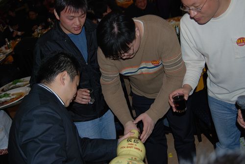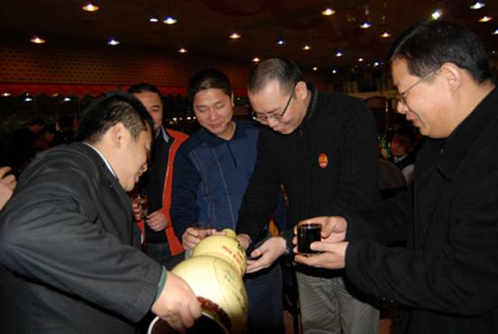 公司孫總為各位經(jīng)理們倒酒,這酒瓶不是一般的大,喝下去也不是一般的勁。