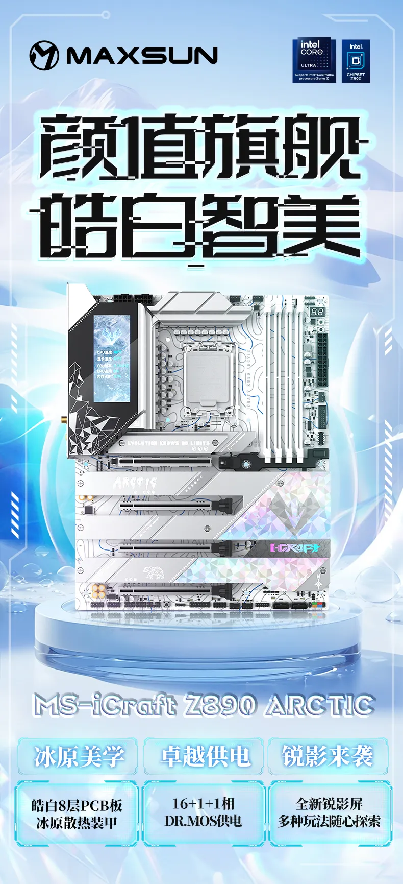 對于喜愛白色裝機的用戶,銘瑄特別準備了一款MS-iCraft Z890 Arctic。創(chuàng)新的冰原美學設計,特殊的鈦冰晶圖案和炫彩元素,配合冰原散熱裝甲,使其在功能與藝術之間達到了平衡。