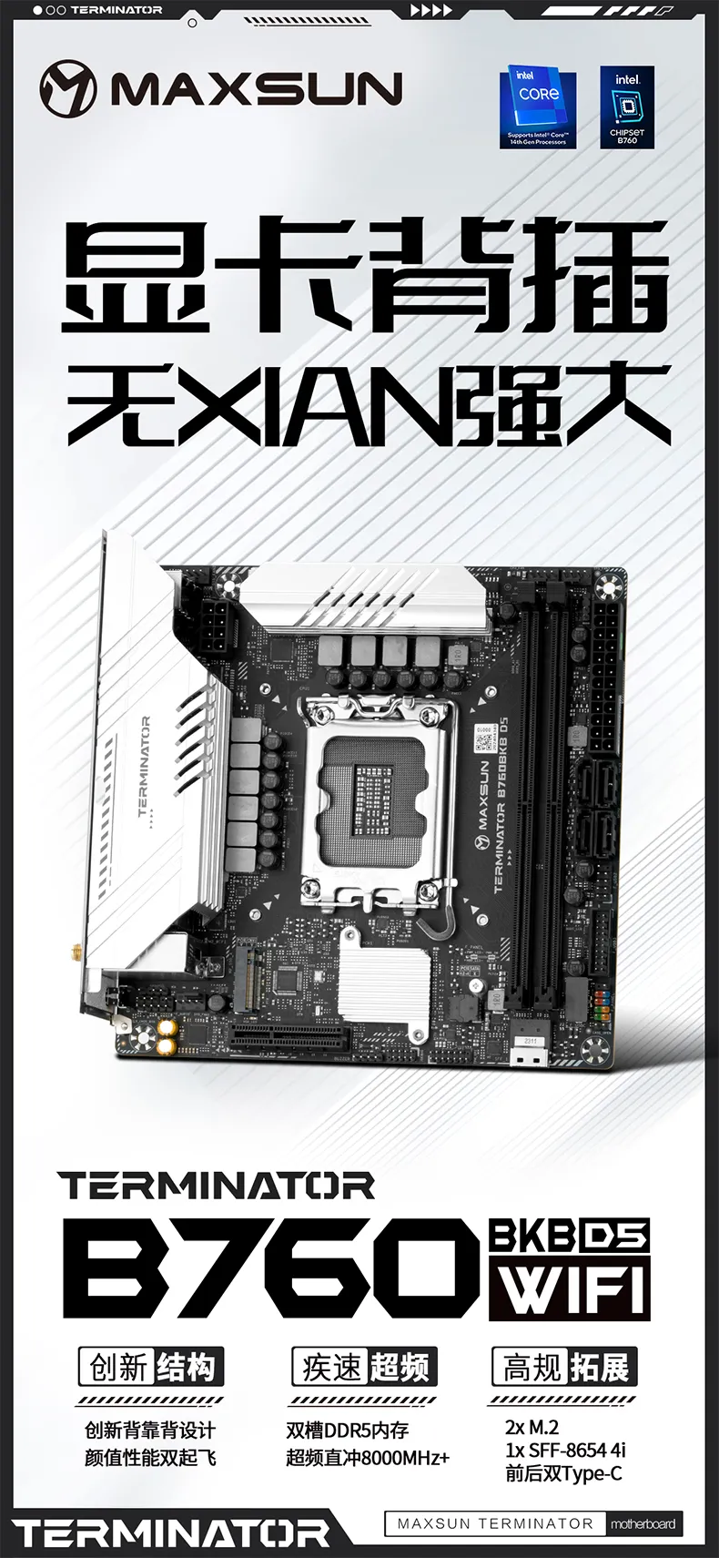 另一臺游戲主機則采用了MS-Terminator B760BKB D5 WIFI主板,重新定義ITX形式,主板和顯卡背靠背設計,無需轉(zhuǎn)接延長線,避免性能損失,節(jié)省價錢的同時,充分發(fā)揮顯卡性能,體積小、性能強、顏值高。