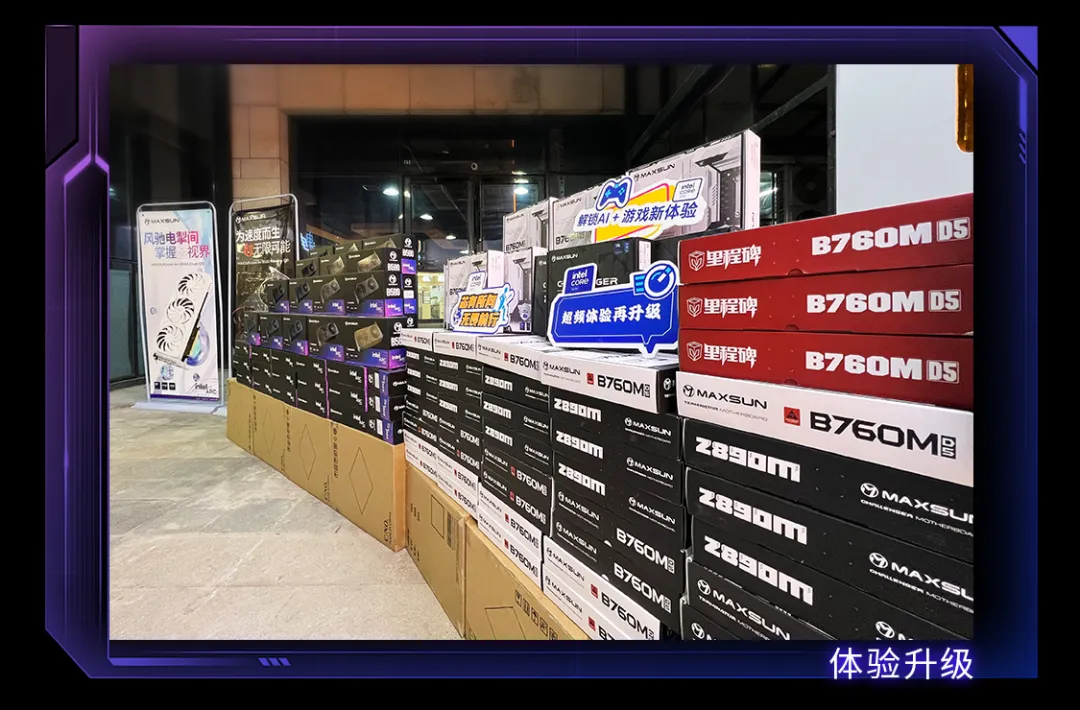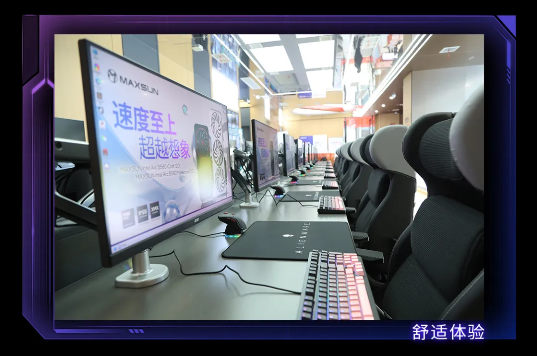 電競館劃分有單人房、雙人房、三人房、八人房等多種競技區,全場共99臺機器,采用銘瑄板卡,包括B760系列主板、Z890系列主板和最新推出的銘瑄Intel Arc B580顯卡。電競館緊跟市場潮流,選擇時興的“3I平臺”(英特爾CPU+英特爾芯片組+英特爾GPU)為玩家提供強悍的性能加持。其中,MS-Challenger Z890M主板 x MAXSUN Intel Arc B580 Milestone 12G x 英特爾®酷睿™Ultra 200S系列處理器的超強搭配可謂最為亮眼