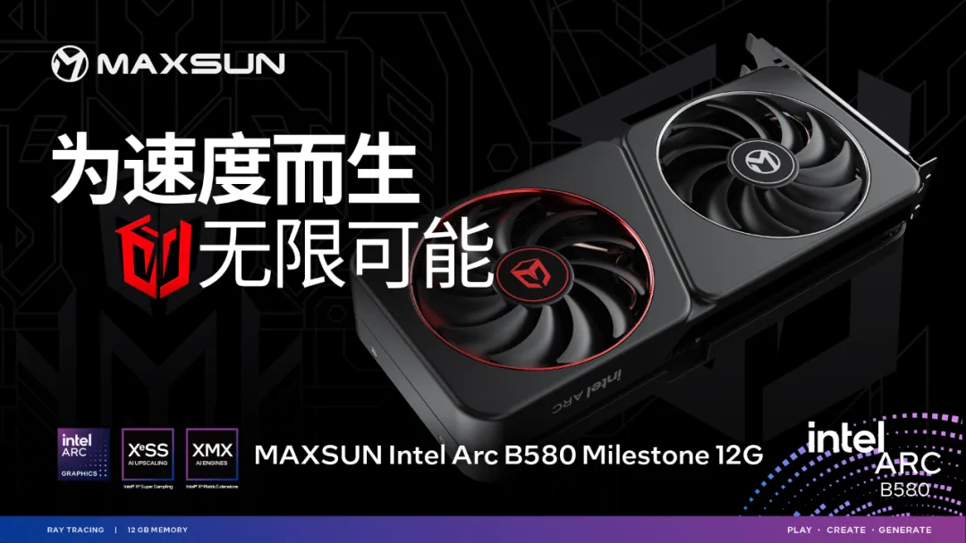 MAXSUN Intel Arc B580 Milestone 12G顯卡,為速度而生,無論是性能、散熱、外觀上都有著出色表現。12GB超大顯存,即使在高負載游戲中都能輕松應對。