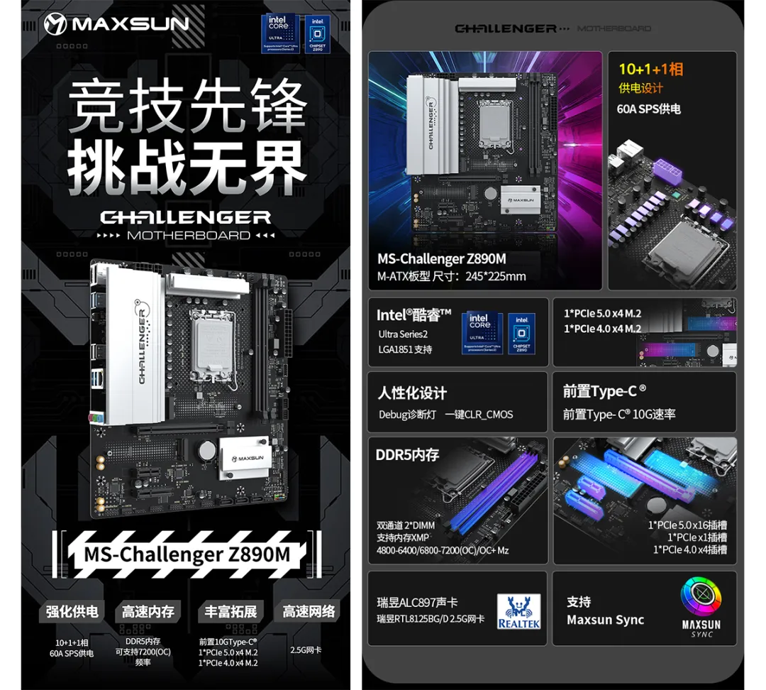 MS-Challenger Z890M主板,Z890系列的性價比優選。采用10+1+1相60A SPS供電,更先進的SPS技術,更佳化每一相電源,電源調控更高效,充分發揮CPU潛能。內存方面,配備2*高速DDR5內存插槽,超頻沖擊7200MHz。同時具有備受好評的Debug燈和CLR_CMOS按鍵,人性化設計為用戶提供便利。