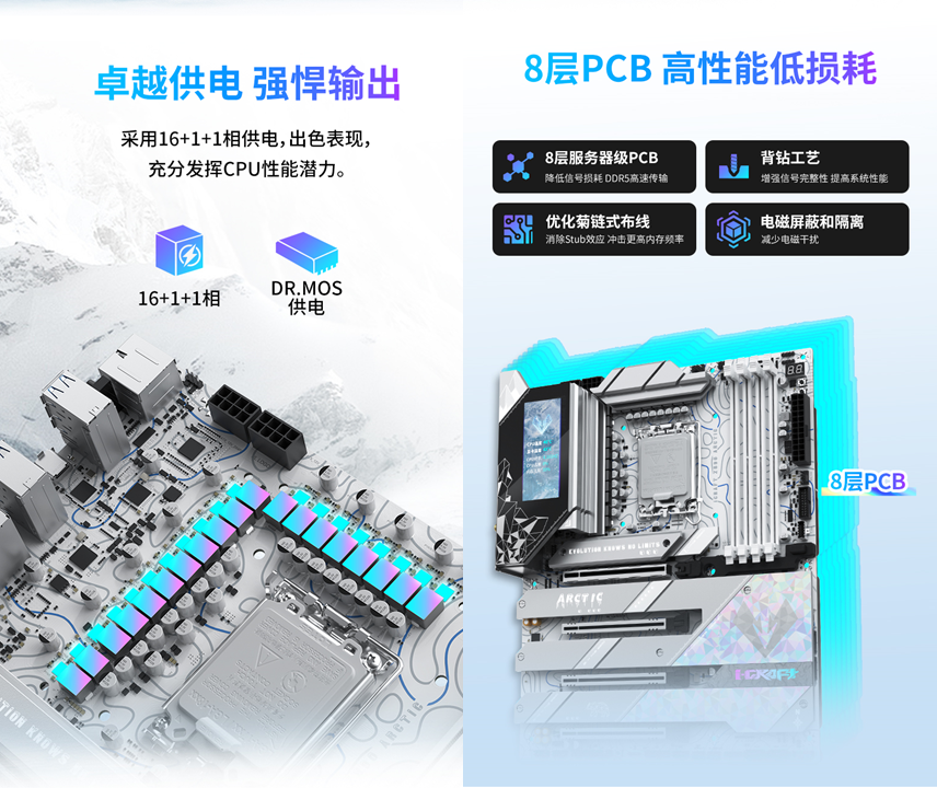 而要讓這顆 “強芯” 充分釋放潛能,離不開一塊實力與顏值兼備的主板 —— 銘瑄 iCraft Z890 Arctic 正是這樣的存在。這款主板作為iCraft系列的高端型號,以 “北冰洋” 為設計靈感,采用冰原美學設計。特殊的鈦冰晶圖案搭配炫彩元素,整體色調統一且富有質感,擺在機箱中宛如一件冰雕藝術品,完美適配當下流行的白色主機風格,與《戰地 6》的冰雪戰場形成奇妙呼應。
