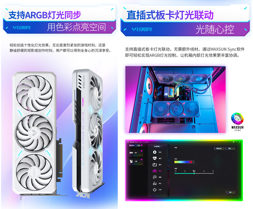 更貼心的是,它支持直插式板卡燈光聯動,無需額外線材,通過MAXSUN Sync軟件即可實現ARGB燈光控制,當你在《戰地6》中觸發沙塵暴天氣時,主機內流轉的沙色光影與屏幕場景遙相呼應;切換到冰雪戰場時,冷調燈光又與漫天飛雪相得益彰,沉浸式體驗直接拉滿。