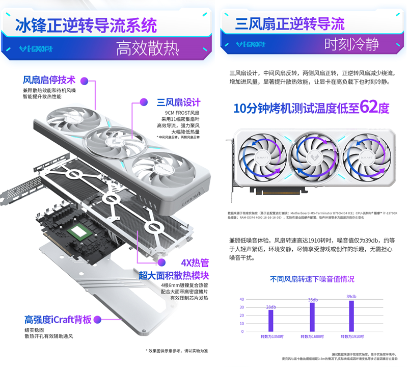 針對《戰地6》長時間團戰的高負載場景,這款顯卡采用創新的正逆轉導流散熱系統,三風扇相鄰旋轉方向不同,顯著減少氣流干擾并提升進風效率,讓溫度更低,噪音控制表現更好。在10分鐘Time Spy烤機測試中,MAXSUN Intel Arc B580 iCraft 12G顯卡溫度僅為62℃,以游刃有余的冷靜表現,守護每一分性能的穩定輸出。