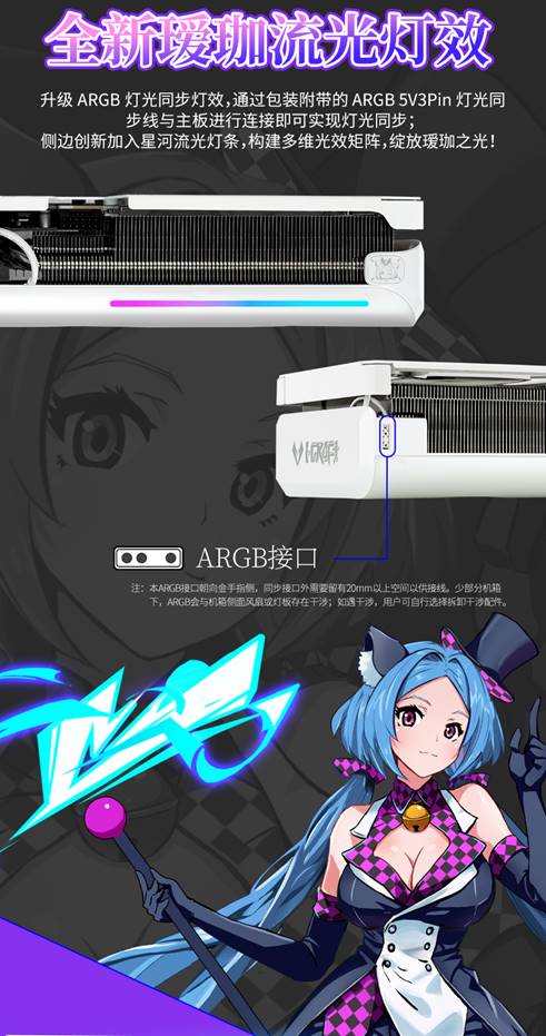 燈效方面,這款顯卡創新加入側邊星河流光燈條,構建多維光效矩陣,支持ARGB燈光同步,為玩家延展出更沉浸的空間。