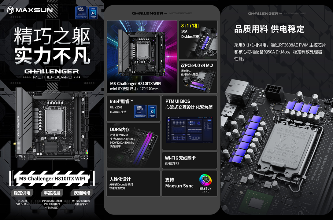 想要發揮處理器性能、連接各類硬件,一款適配性強、功能全面的主板至關重要。銘瑄Challenger H810ITX WIFI主板專為緊湊型主機設計,17cm×17cm的標準ITX 版型,能輕松裝入市面上絕大多數迷你機箱,同時在供電、拓展、穩定性上毫不妥協,堪稱“小而全”的典范。這款主板采用8+1+1相供電設計,搭配RT3638AE PWM主控芯片與每相 50A Dr.Mos ,供電電流穩定且供電能力充足。即便處理器處于高負載運行狀態,也能持續提供穩定電力,避免因供電不足導致的性能波動,能充分釋放英特爾酷睿Ultra 5 230F處理器的性能。