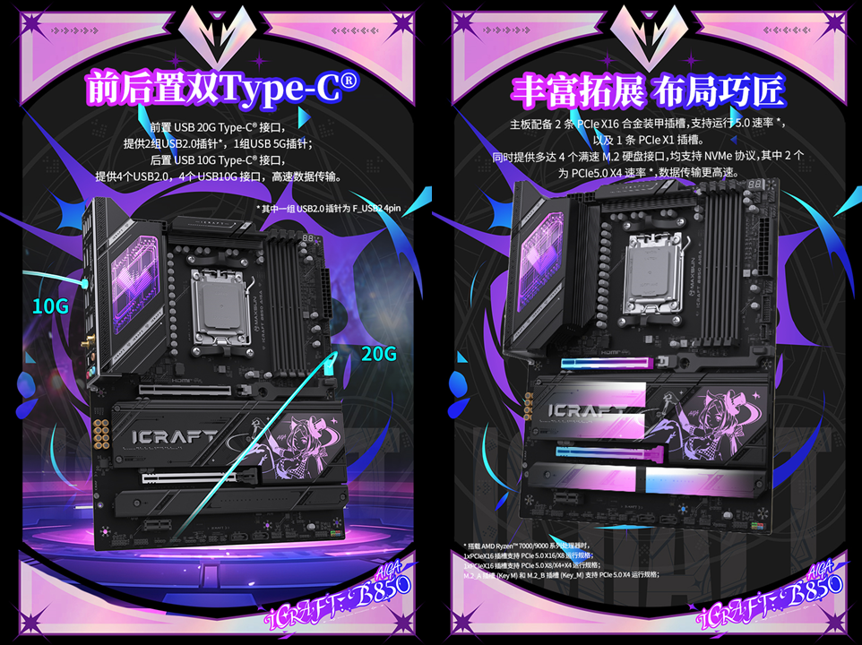銘瑄iCraft B850 AIGA主板在設計上富有巧思,將二次元美學與硬核硬件完美融合,標志性的“璦珈”IP元素貫穿始終,自帶超高視覺辨識度,戳中年輕學生黨的審美偏好。標志性的 Skylight RGB 合金散熱裝甲,凌厲的金屬質感之上,幻彩 RGB 線條如流光般交織流轉,仿佛注入了靈動的魔法能量,隨呼吸燈效變幻出萬千色彩,為機箱內部營造出沉浸感的光影氛圍。主板正面大面積的 M.2 散熱裝甲上,全新設計的璦珈形象靈動吸睛,背板處也巧妙點綴著同款元素,從正面到背面,每一處細節都在釋放獨特的 “璦珈魔法”,讓二次元愛好者一眼淪陷。